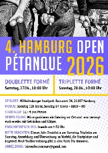 | 21 | 22 | 23 | 24 | 25 | 26 | 27 Hamburg Open Pétanque 2026: Doublette & Triplette Tournament |